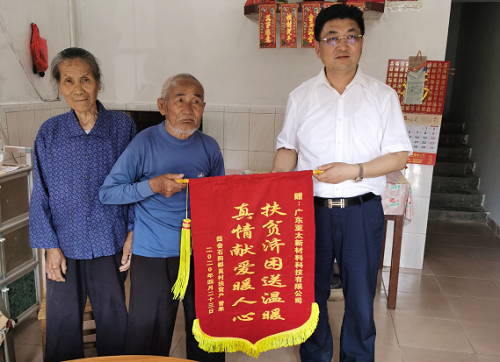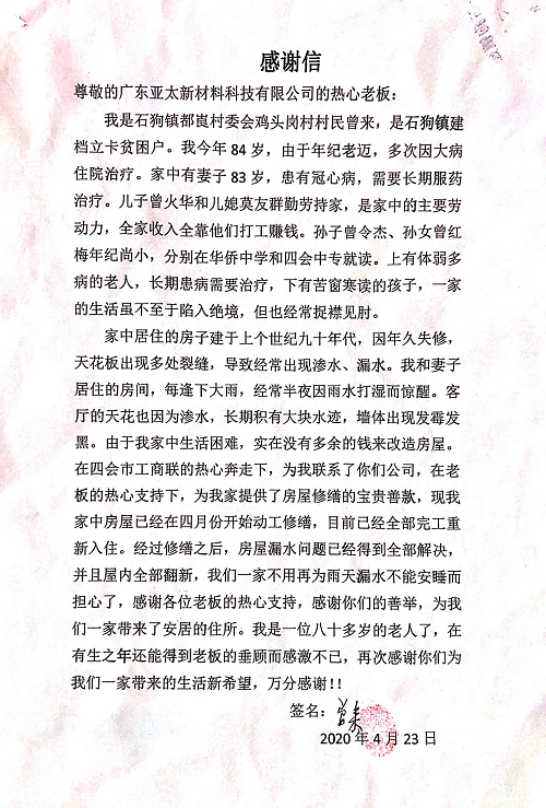 曾来代表全家人愉快接受了朱增余董事长代表广东亚太公司的捐助,并激动的说:“感谢朱董的慷慨捐助,您真是人民的好代表,老百姓信得过的好人,好老板。有了这一笔修缮款,可以将房顶渗漏修补,不用下雨时就因到处漏雨而睡不着了”。为感谢亚太公司的无私帮助,曾来还代表家人赠送“扶贫济困送温暖,真情献爱暖人心”锦旗和一封感谢信给广东亚太公司。