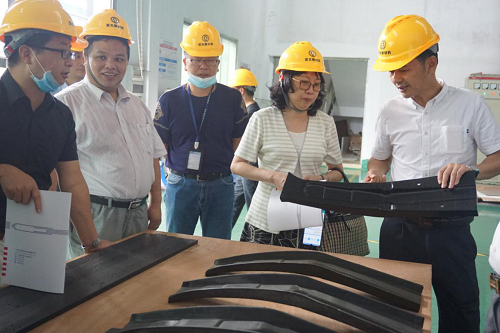 图:贾锐常务副会长(右二)、田虹常务副会长(左一)、陈军忠副市长(右一)一行在复材制造生产车间进行实地调研