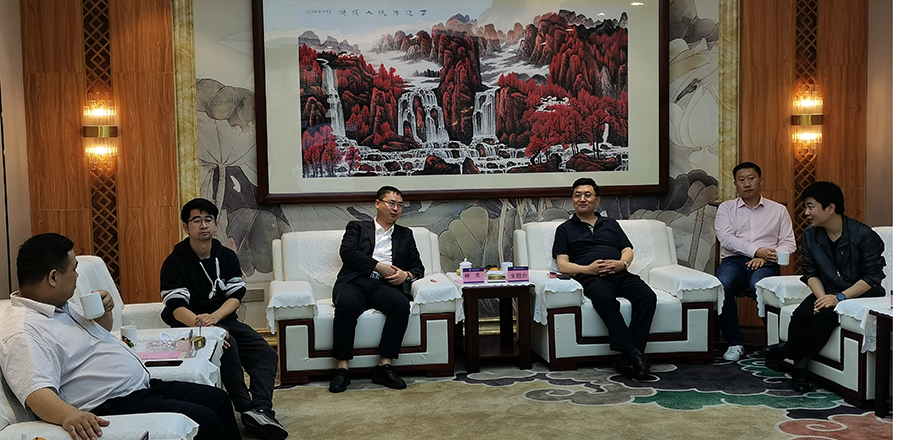 四会市人大常委会主任邹卫无(左四)、市委常委、大沙镇党委书记邓宏安(左一)向杨忠(左三)一行介绍四会市的产业发展布局和投资环境等情况