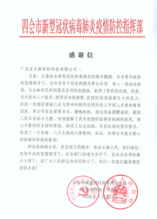 广东亚太公司捐款10万元支助四会市 中医院抗击新冠肺炎疫情阅读次数:934 | 发布日期:2020/2/27 | 作者: | 来源: